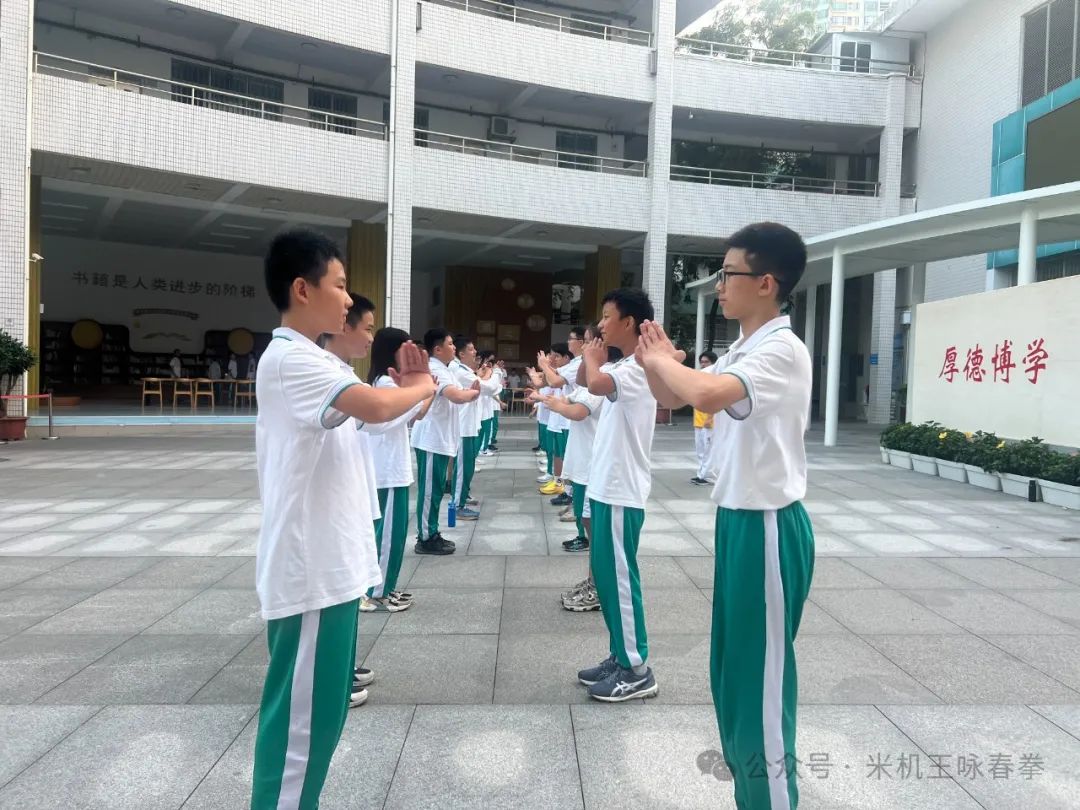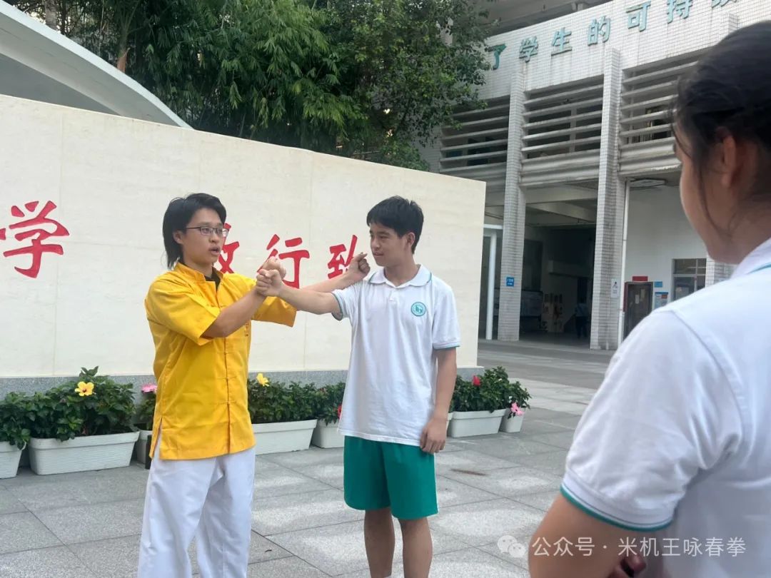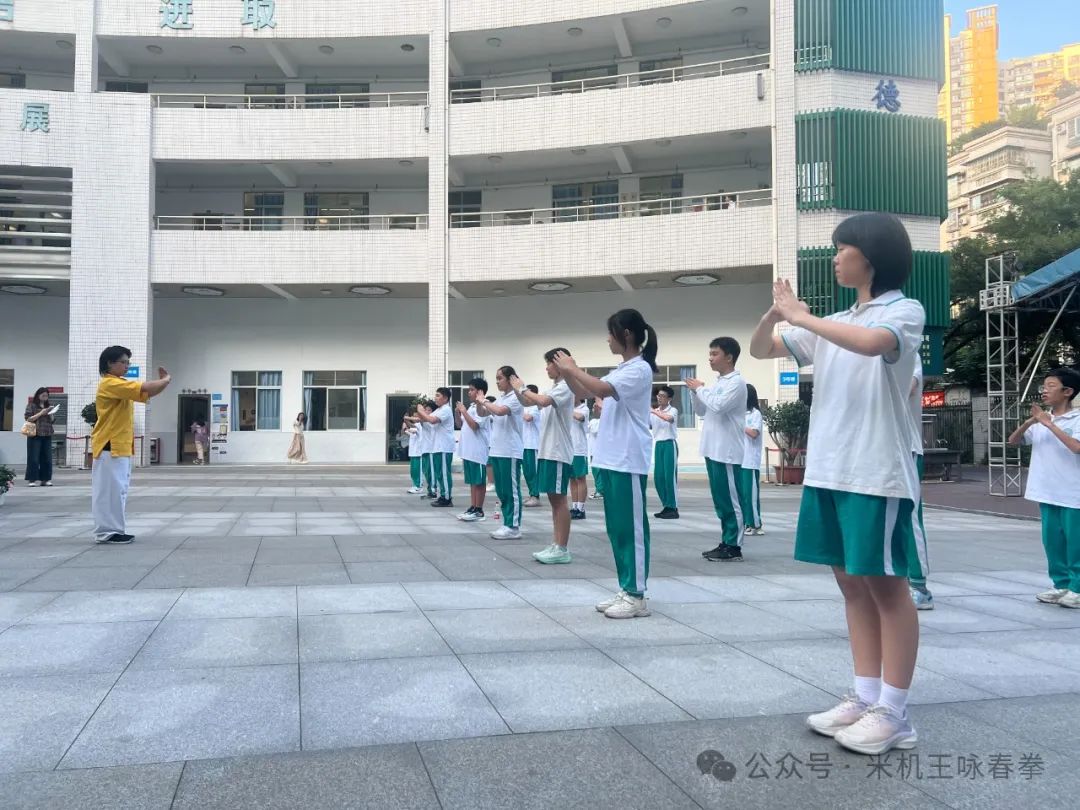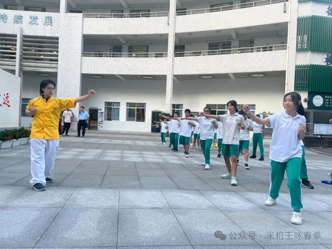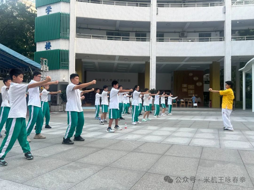 在113中学的校园里,一股浓厚的武术氛围扑面而来。传承人黄冬薇身穿米机王咏春馆馆服,身姿矫健,拳法精准,仿佛将学生们带入了一个充满尚武精神的武侠世界。孩子们目不转睛地观看,眼神中闪烁着对武术的热爱与向往。